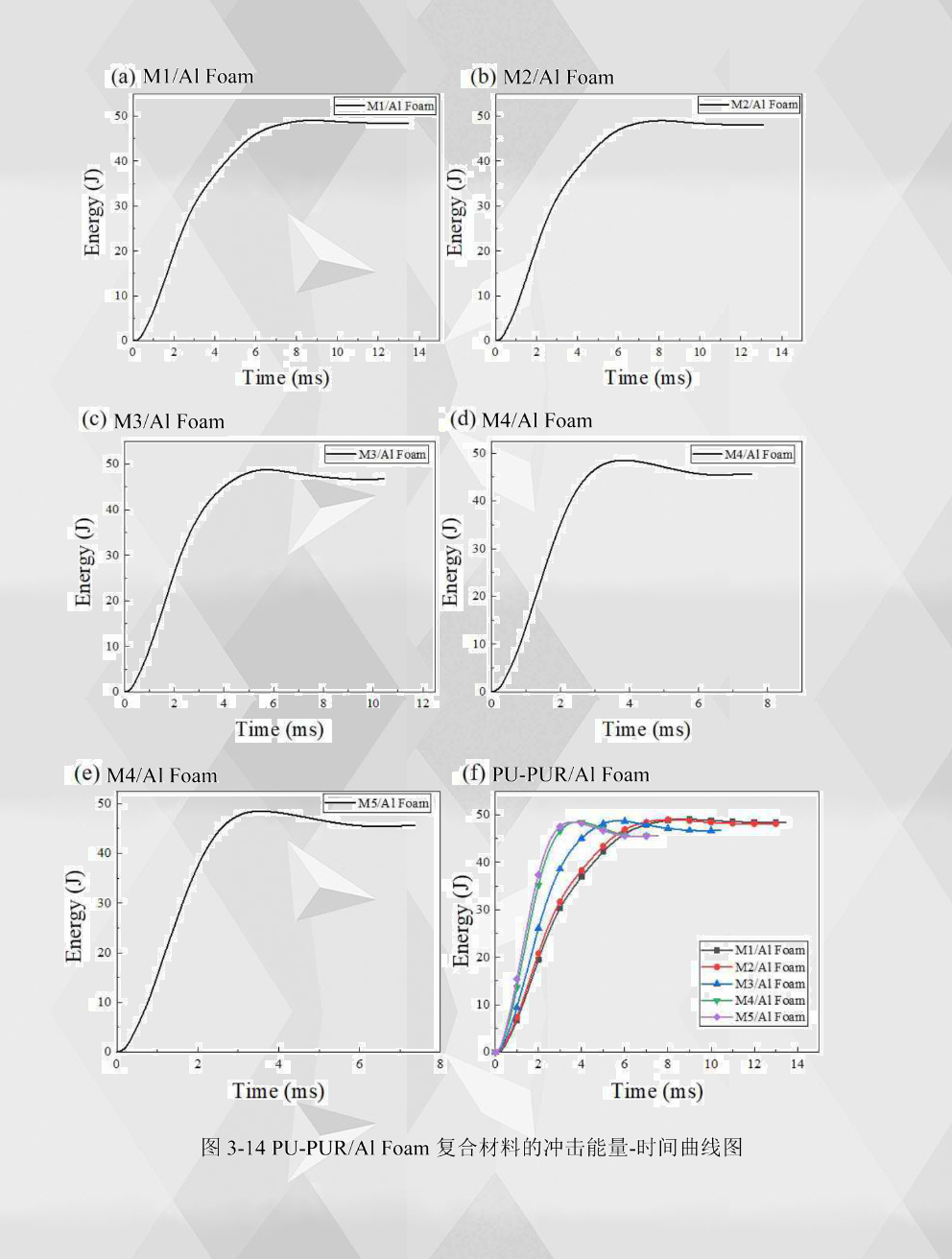 在第三個(gè)階段,沖擊能量有少量減少,這是由于沖頭沖擊復(fù)合材料后發(fā)生了回彈, 大部分的沖擊能量被復(fù)合材料所吸收,而有少量能量沒(méi)有被復(fù)合材料吸收,這部分能量 就是回彈能量,回彈能量在能量-時(shí)間上表現(xiàn)為峰值能量和穩(wěn)定能量的差值。從吸收能量來(lái)看 ,M1/Al Foam和M2/Al Foam吸收能量分別為48.413J和48.076J,其回彈能量分別為0.666J和0.938J,其吸能比達(dá)到了98.64%和98.09%。樹(shù)脂中聚脲含量較高的M4/Al Foam和M5/Al Foam的復(fù)合材料吸收能量分別為45.466J和45.427J,其回彈能量分別為3.052J和3.049,其吸能比達(dá)到了93.71%和93.71%。而對(duì)于M3/Al Foam復(fù)合材料,即樹(shù)脂中聚氨酯和聚脲含量都為50%時(shí),其吸收能量為46.666J,其回彈能量為2.096J,其吸能比為95.70%。