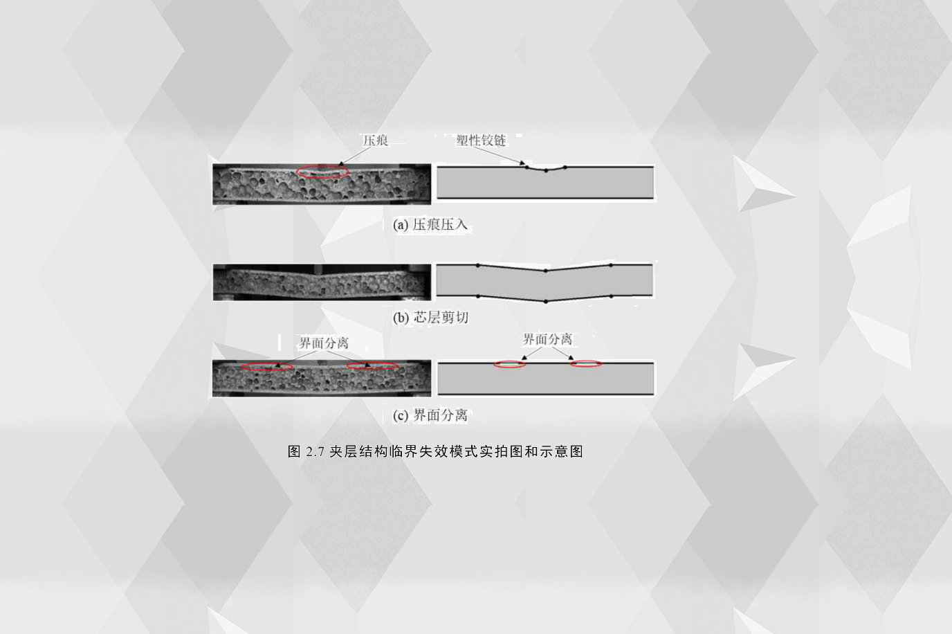 通過(guò)實(shí)驗(yàn)觀察分析得出,泡沫夾層結(jié)構(gòu)在彎曲工況下三種主要的臨界失效模式為壓痕壓入、芯層剪切和界面分離,如圖2.7所示。臨界失效模式壓痕壓入(IN)的主要特征是壓頭正下方部分夾層結(jié)構(gòu)的上面板有鉸鏈并且附近的芯層有明顯的局部壓痕;通過(guò)圖2.7(a)可以觀測(cè)到,壓頭附近的上面板有三個(gè)鉸鏈,而在此時(shí)刻下面板的位移很小,基本可以忽略其位移量。如圖2.7(b)所示,臨界失效模式芯層剪切(CS) 的主要特征是上下面板位置平行,并且上下面板各有三個(gè)鉸鏈,鉸鏈的位置一個(gè)位于壓頭正下方,兩外兩個(gè)分別位于兩支撐端附近,該失效模式與Ashby等人在參考文獻(xiàn)中提到的ModeB類似。最后一種臨界失效模式為界面分離(DB),夾層結(jié)構(gòu)膠粘劑的完整性確保了載荷在夾層結(jié)構(gòu)各組成部分之間穩(wěn)定傳遞;根據(jù)剪切力互等定理,在臨界失效模式發(fā)生之前,泡沫芯層受到的剪切應(yīng)力等于膠粘劑的剪切應(yīng)力,但在僅涉及由剪切應(yīng)力引起的臨界失效模式的情況下,如果夾層結(jié)構(gòu)受到的最大剪切應(yīng)力超過(guò)膠粘劑所能承受的剪切強(qiáng)度,但小于芯層所能承受的剪切強(qiáng)度,則可能會(huì)發(fā)生界面分離(DB)。