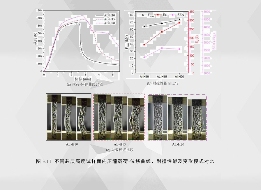 從其耐撞性指標圖3.11(b)中可以看出,鋁合金夾層結構的峰值載荷及總吸能隨芯層高度的增加而增加,而其比吸能的變化趨勢則不然。當夾層結構的芯層高度從10mm增加到15mm,試件在第三階段的主要失效模式由整體屈曲變?yōu)槊姘迩緦悠茐姆绞揭舶l(fā)生了變化,由于后者的失效模式吸收的能量比前者多很多,所以即使結構的重量有所增加,但AL-H15的比吸能(SEA)仍比AL-H10高。而當夾層結構的芯層厚度從15mm增加到20mm時,試件在第二、三階段的主要失效模式基本未發(fā)生變化,雖說后者在第三階段的吸能會更多一些,但畢竟總吸能提高的幅度有限,所以AL-H15比AL-H20的比吸能(SEA)更高。